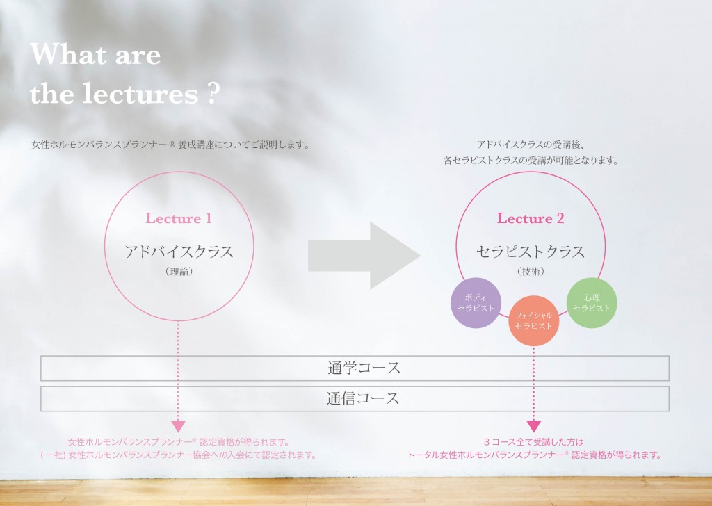 セラピストクラスは【ボディセラピスト】・【フェイシャルセラピスト】・【心理セラピスト】の3コースに分かれます。身体、肌、心に対するスキルを身につけ、セラピストとして女性ホルモンのお悩みに応えることのできるスペシャリストを目指します。